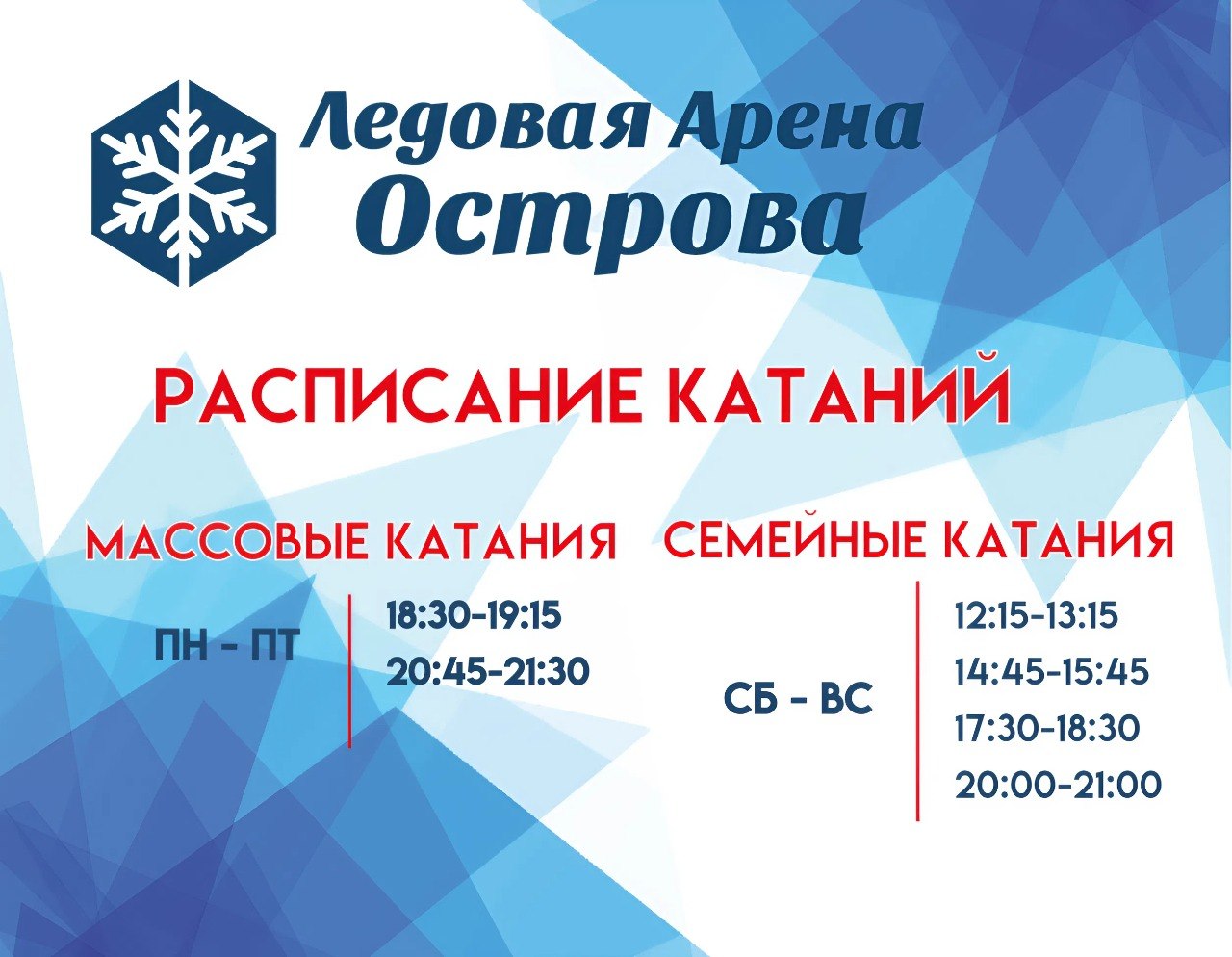 Расписание катаний Понедельник — пятница Массовые катания: 18:30 — 19:15 20:45 — 21:30 Суббота —...